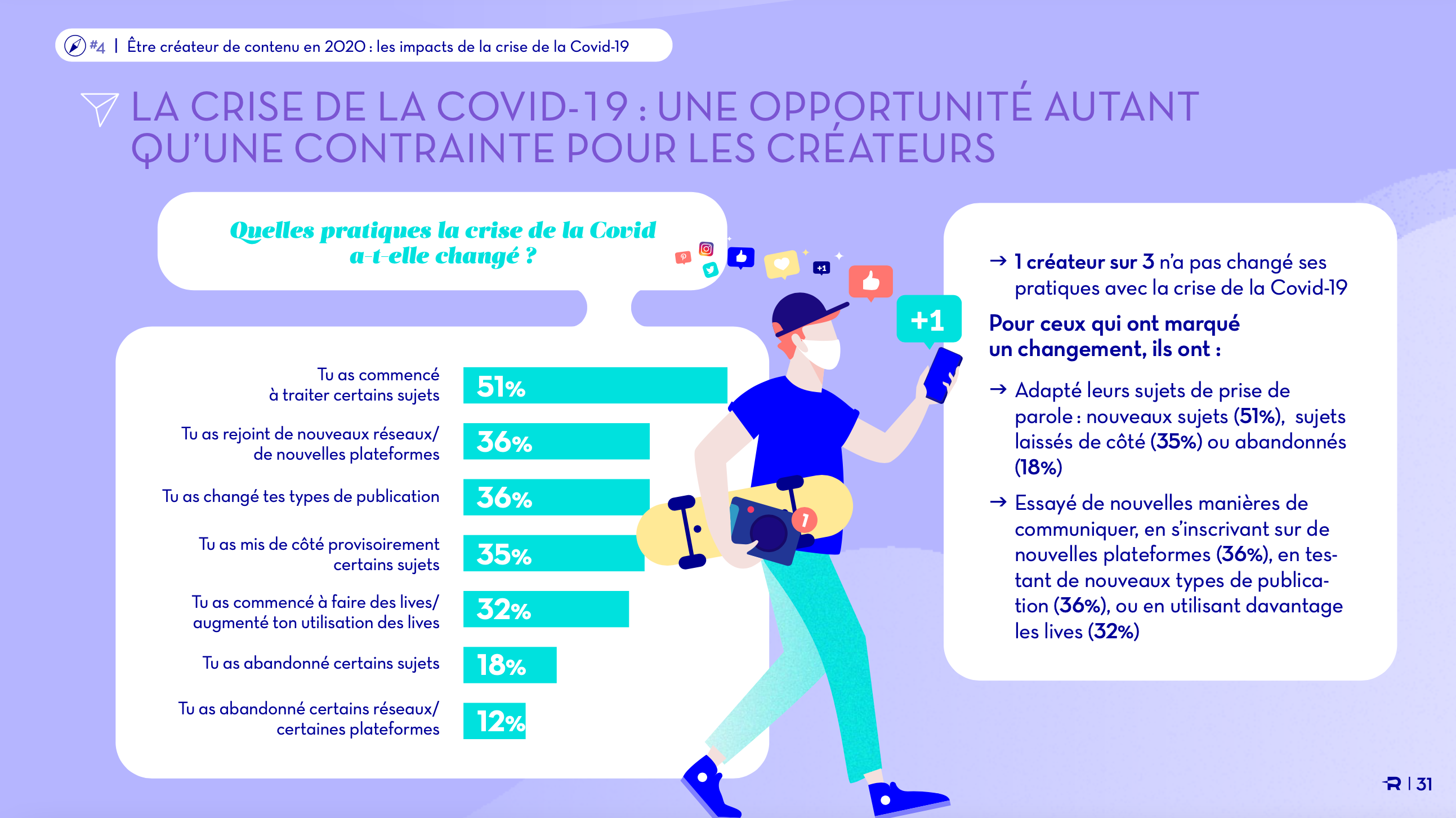 Malgré la crise sanitaire, notamment pour certains secteurs directement touchés par les restrictions, la passion reste intacte. 84% des répondants sont toujours autant (voire plus) satisfaits de leur rôle de créateur de contenu en 2020. Les conditions sont difficiles mais 1 créateur sur 3 n’a pas changé ses pratiques pendant la crise. Pour ceux qui ont marqué un changement, ils ont adapté leurs sujets de prise de parole : nouveaux sujets (51%), sujets laissés de côté (35%) ou abandonnés (18%). Ils ont aussi essayé de nouvelles manières de communiquer, en s’inscrivant sur de nouvelles plateformes (36%), en testant de nouveaux types de publication (36%), ou en utilisant davantage les lives (32%).