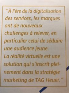 La Réalité Virtuelle est une solution qui s’inscrit pleinement dans la stratégie marketing de TAG Heuer. La marque a conscience de l’intérêt des consommateurs et des possibilités offertes par ce nouveau support marketing. Cette technologie, à la fois canal, support et plateforme, permet aujourd’hui de se démarquer de la concurrence et d’atteindre plusieurs objectifs, de la brand awareness pure au marketing direct.